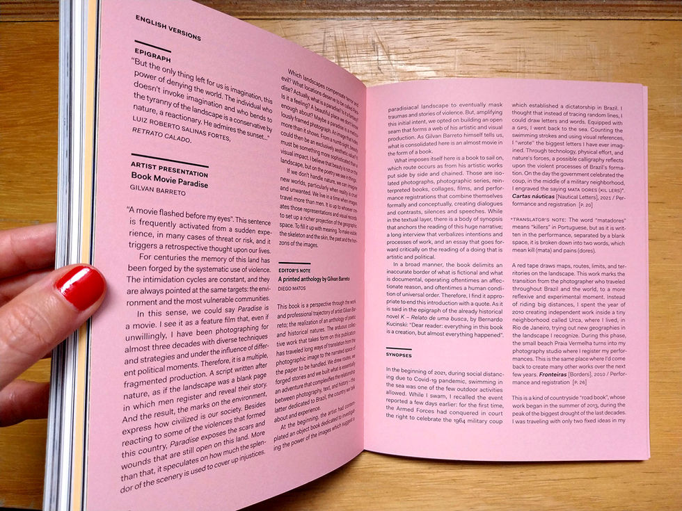 Paraíso é como um filme. Concebido como uma narrativa de longa-metragem, o artista visual e fotógrafo Gilvan Barreto reune neste livro o que fotografou por quase três décadas, com técnicas e estratégias diversas. Séries fotográficas, colagens, livros reinterpretados, registros de ação, filmes se intercalam com um corpo de sinopses que ancoram a leitura dessa grande narrativa.
